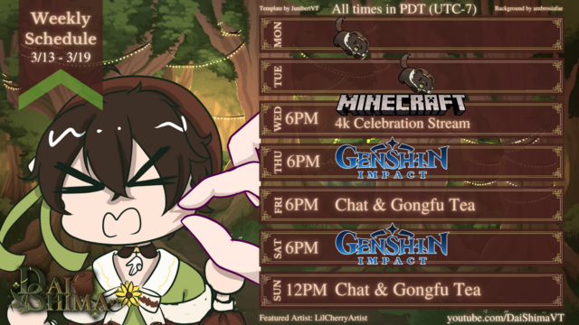 Weekly Schedule (3/13 - 3/19) ) 4k Celebration! First Minecraft stream (will do more if it does well)