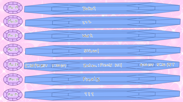 Woo New Schedule is up! School is killing me with finals so no idea about times exactly but I'll damned right do my best! Also I'll try to upload but no promises.