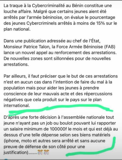 D'après une forte décision à l'assemblée nationale tout jeune n'ayant pas un job ou boulot pouvant lui rapporter un salaire minimum de 100000f le mois et qui est déjà au dessus d'une telle dépense selon ses biens matériels (iphone, moto et autres sera arrêté et sans aucune preuve de défense de son côté pour une justification).
