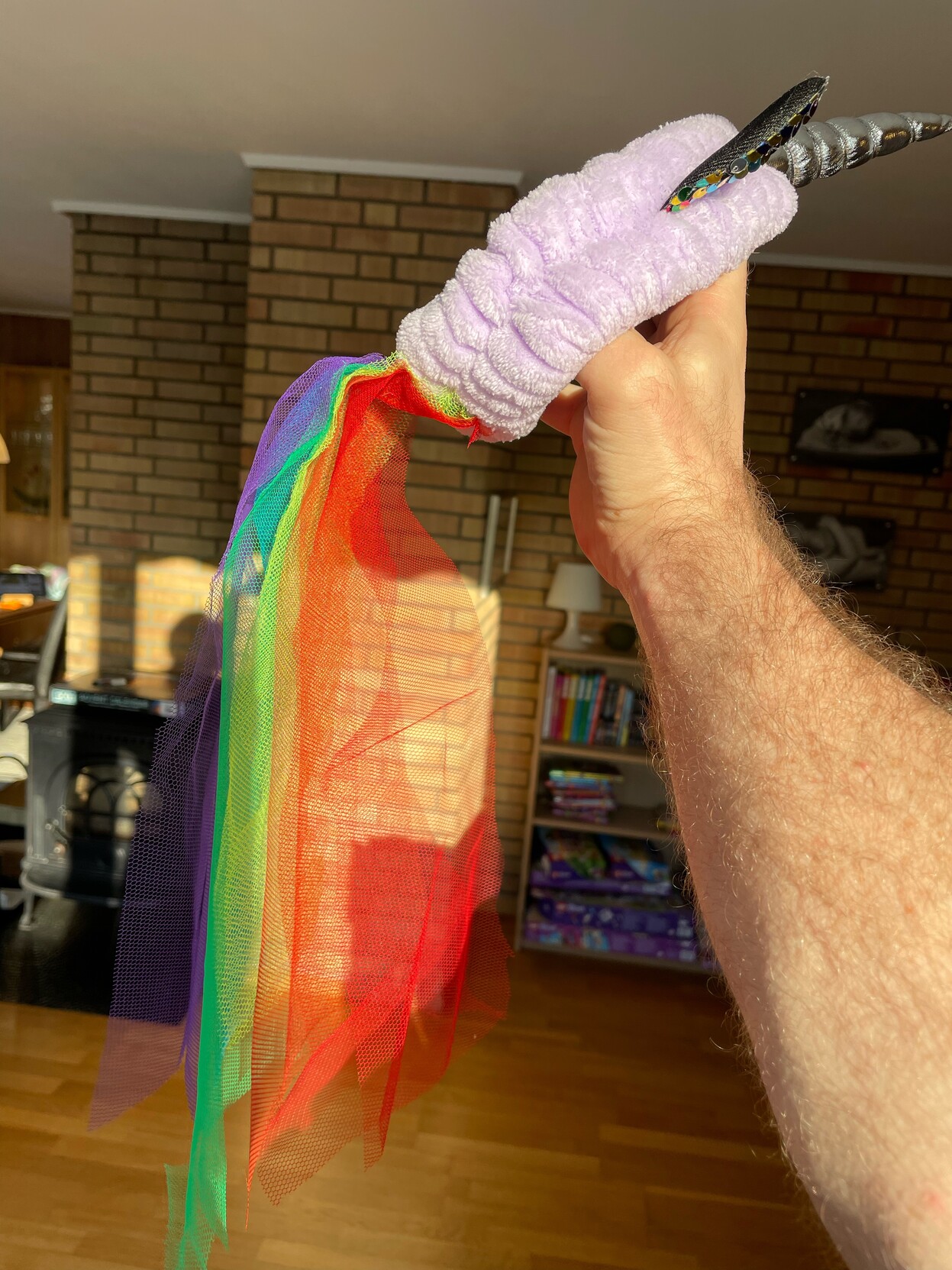 Rather than painting minis I’ve been making a rainbow unicorn outfit for the upcoming ‘Karnival’ at my daughters school. Headband and mane finished, next up tail-belt.