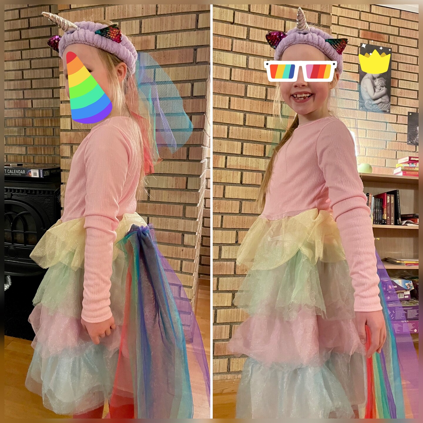 With some help from my daughter, who learnt to sew this evening for attaching a button, the unicorn costume is finished.