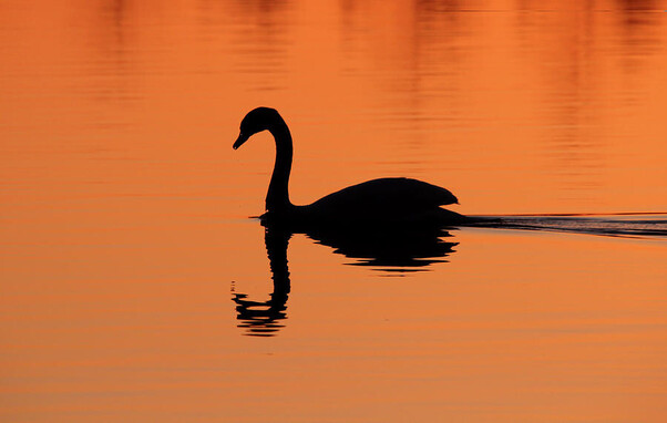 The sun was setting as the Mute Swan was heading back to the nest after a long, hard day chasing Canada Geese. Sunset cast an orange glow on the slightly rippled water as the Swan gently glided home.