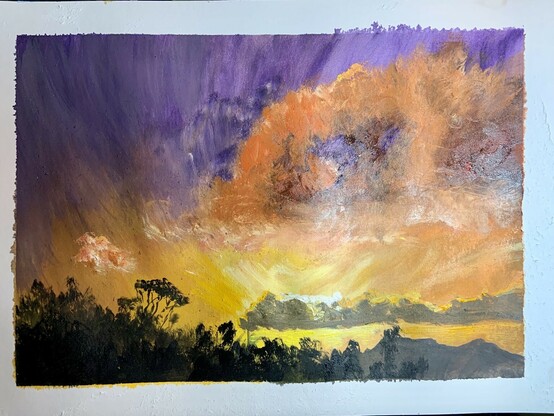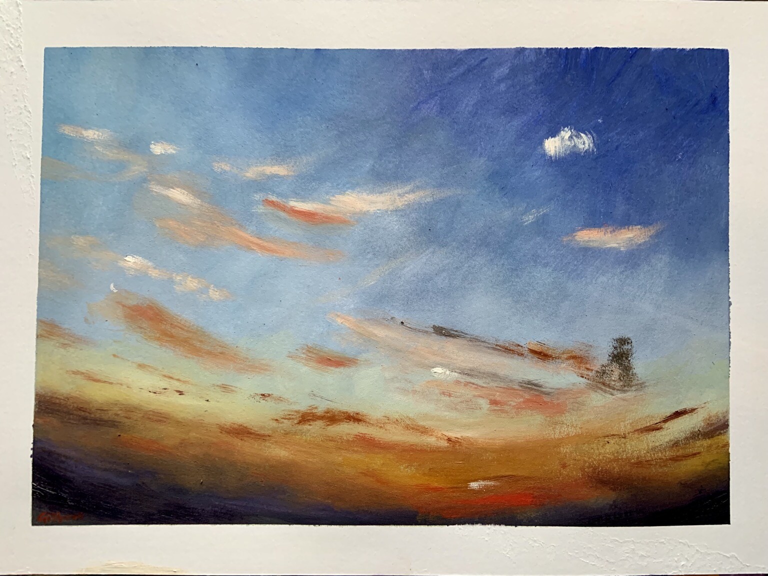 Sunset sky. Inspired by a brilliant photo by @welshpixie. Water mixable oils on cartridge paper. #MastoArt #painting #watermixableoils #sunset