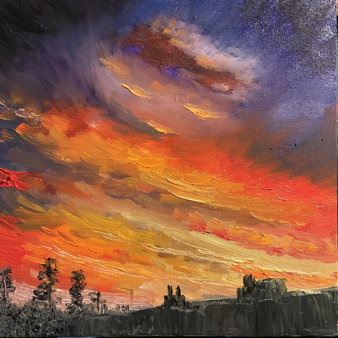 South African Sunset. First pass at this - using water mixable oils and water as a thinner. On cartridge paper. Sorry for the glare from my lights, it’s very dark here I will try to get a better photo tomorrow. Huge shoutout to @welshpixie who took the original photo which was amazing and I don’t feel I’m doing it justice here! #watermixableoils #oils #painting #sunset #MastoArt