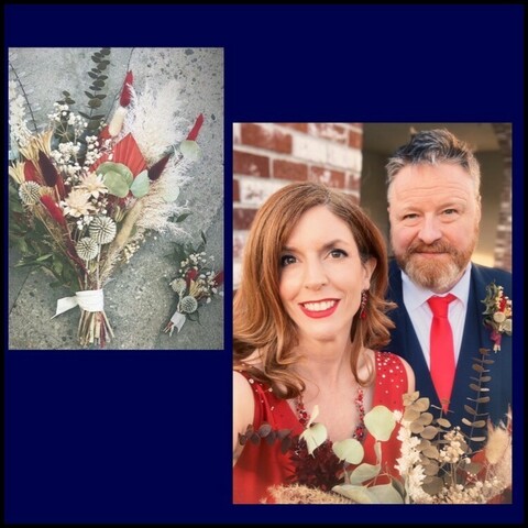 The magnificent dried autumnal space bouquet and boutonnière by Backbone Floral for our November 5 American wedding! I love the contrasts with my red dress and the dark blue suit of @garethlpowell