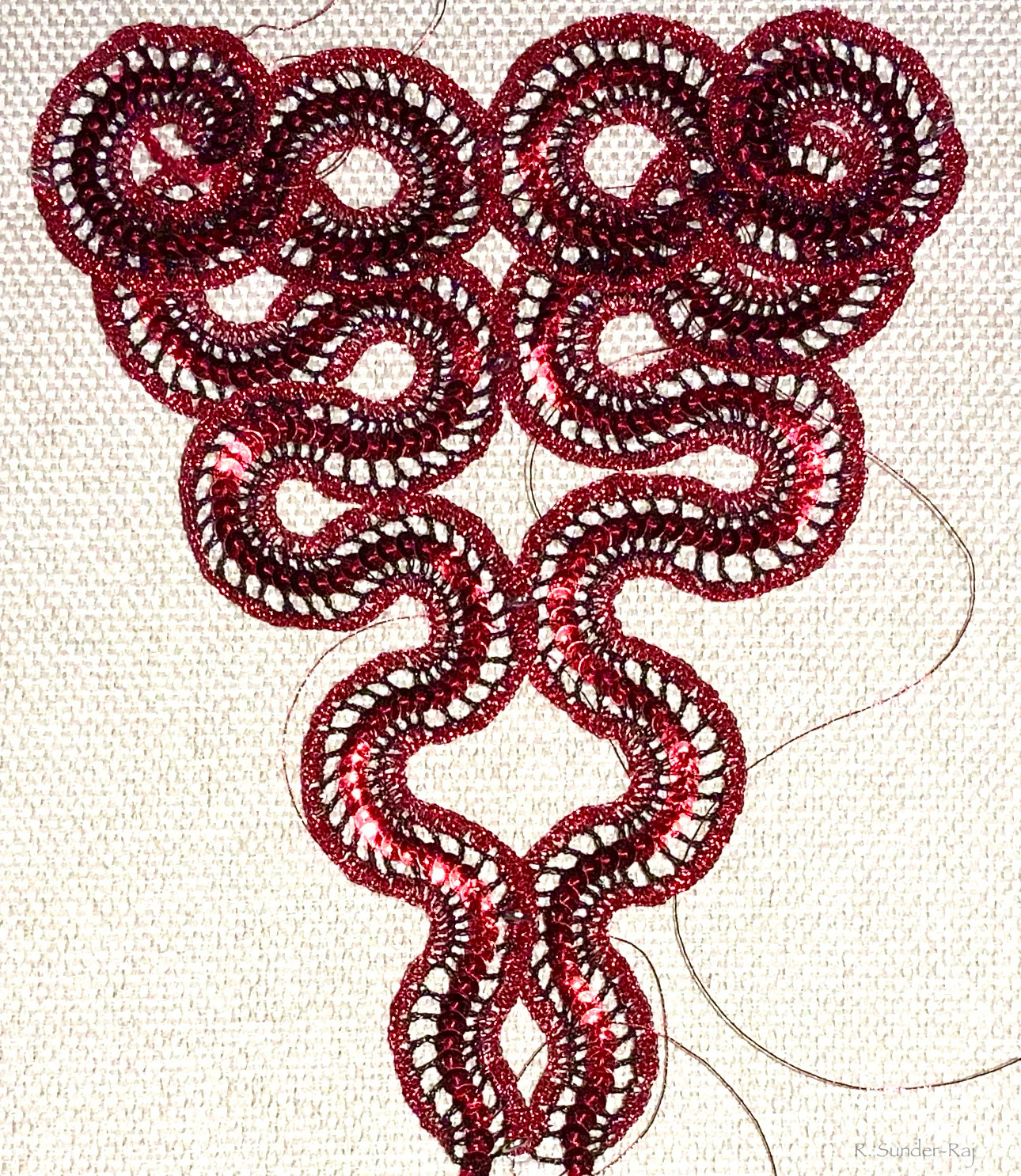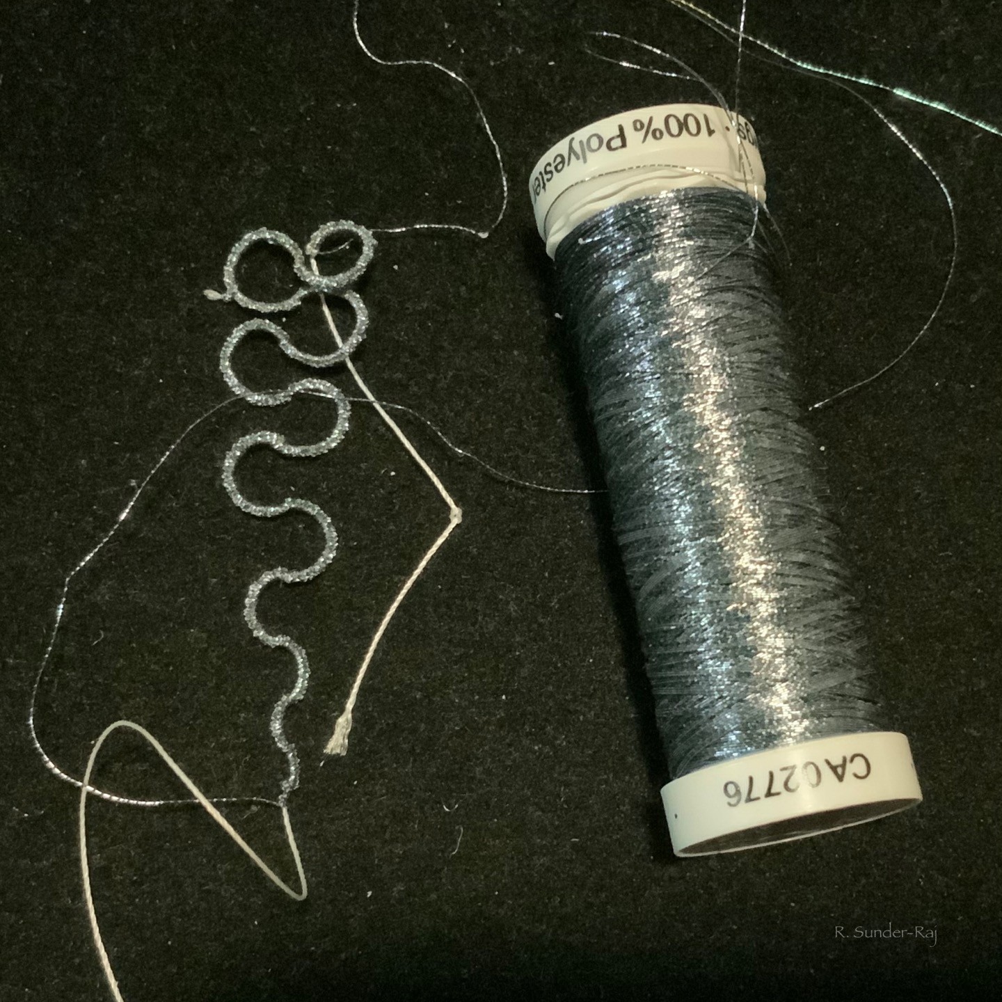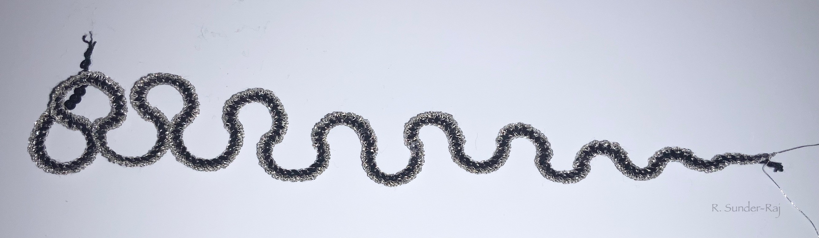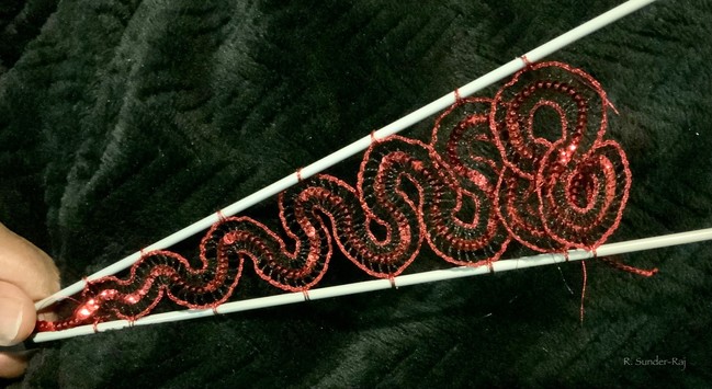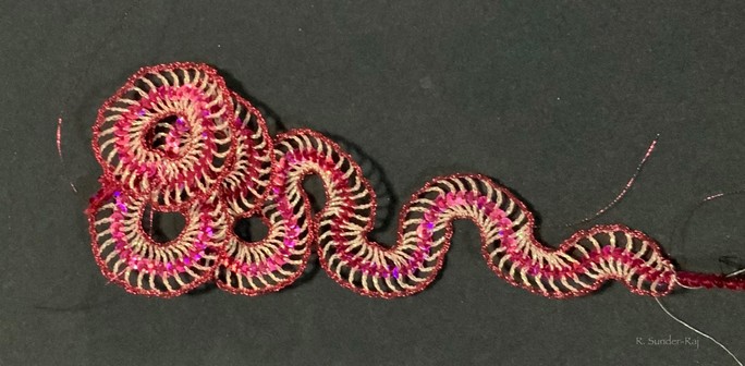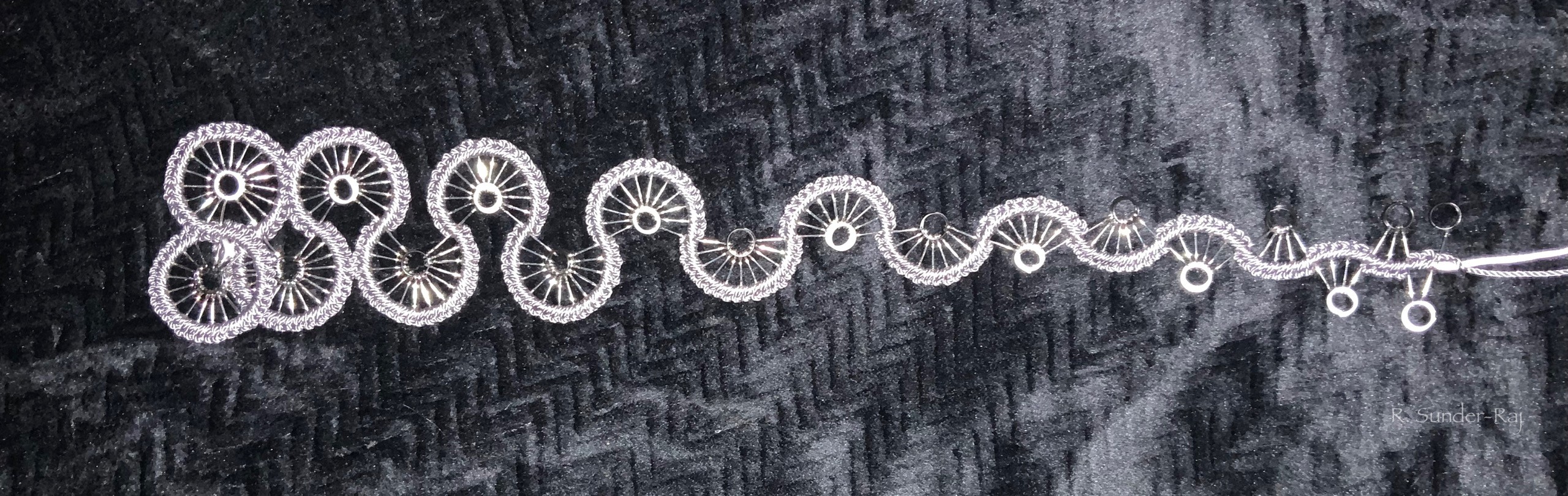 A squiggle tatted with metallic thread.