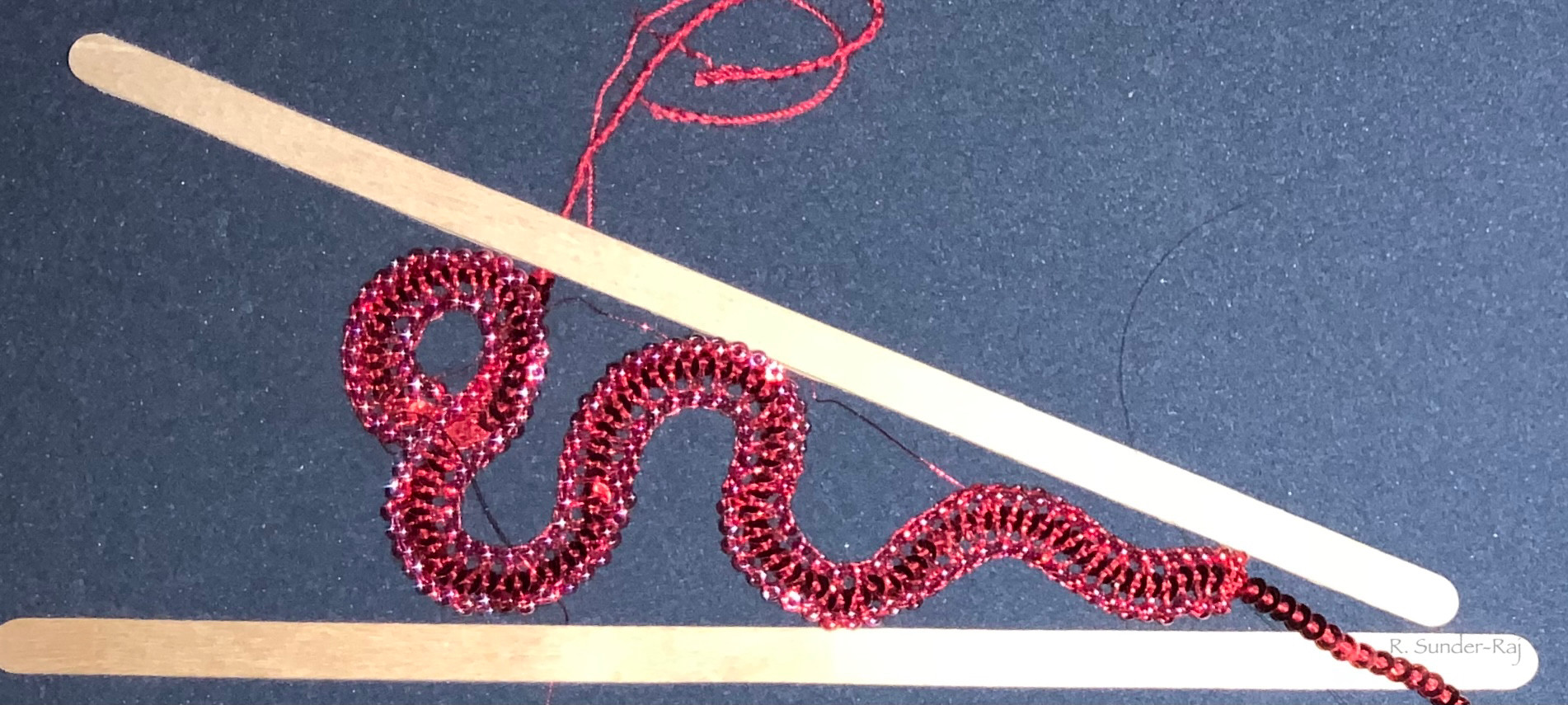 I tried making a second squiggle pair, but this one has the end circles left open rather than working them as a loop of stitches.