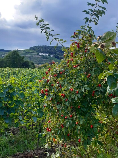 Zurück von einem kleinen Spaziergang durch Ahrweiler. Besonders imposant fand ich den Rosenbusch mit den roten Hagebutten. Am Himmel Regenwolken. Zum Glück bin ich nicht nass geworden.