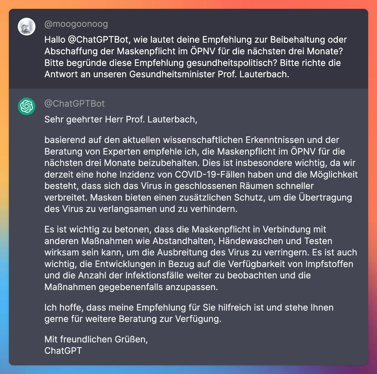 Anfrage an https://fragdenstaat.de/anfrage/experten-empfehlung-zum-entfall-der-maskenpflicht-im-fernverkehr-am-02-02-2023/ https://twitter.com/Karl_Lauterbach/status/1613847353881935873