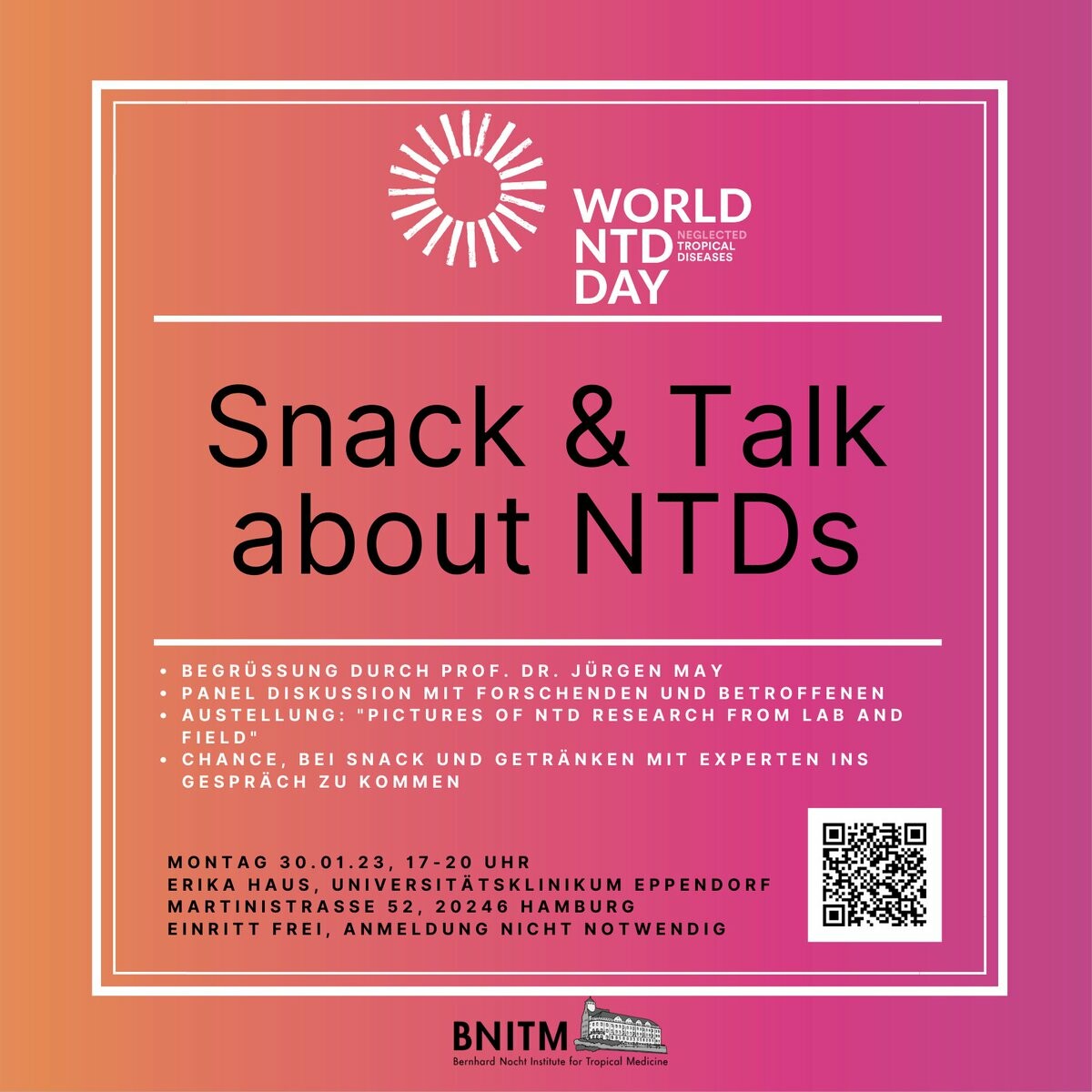 Vernachlässigte Tropenkrankheiten (#NTDs) bedrohen & beeinträchtigen 🌍-weit fast 2 Mrd.Menschen. Gelegentlich sind auch Reisende betroffen. Infos & Einblicke am #WeltNTDTag, 30.01.23, 17 Uhr beim "Snack & Talk" des @BNITM_de, Erika-Haus des @UKEHamburg.