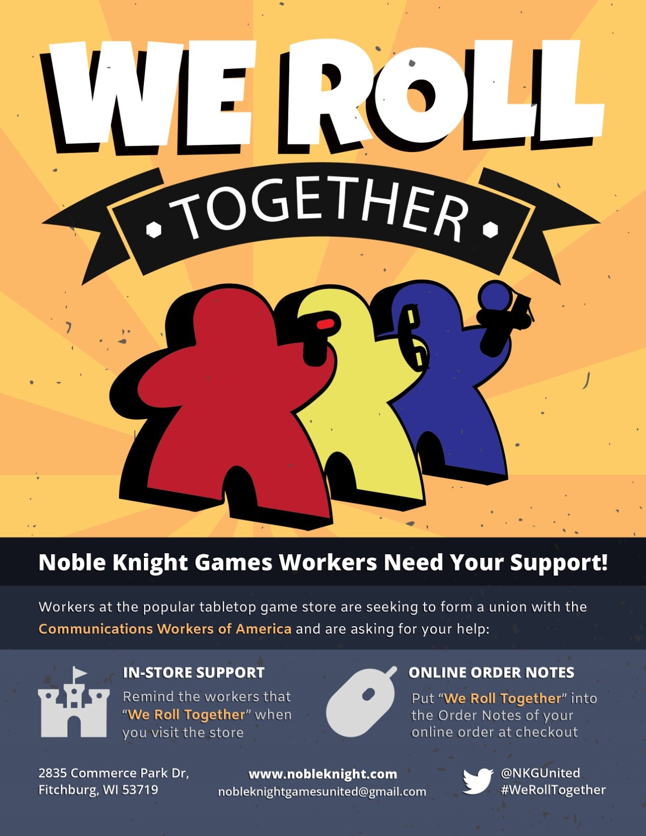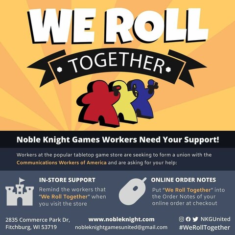 Make sure you put #WeRollTogether in the order notes during online checkout to show support for Noble Knight Games United's effort to form a union!