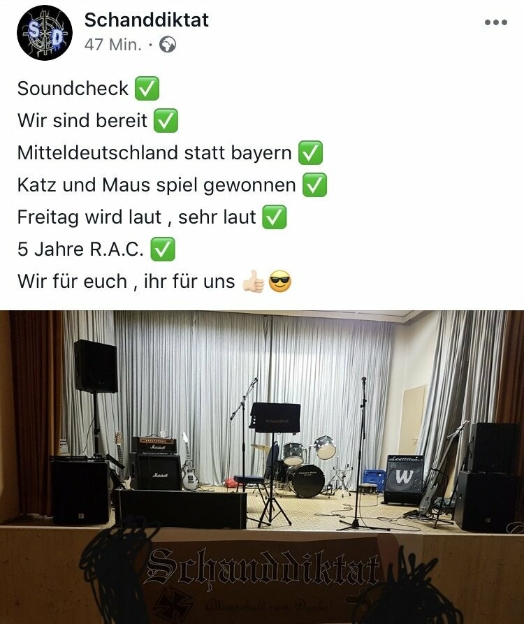 Mit einem Auftritt unter dem Motto »5 Jahre RAC« wollte die Band #Schanddiktat offenbar am Wochenende im Raum #Wertingen auftreten. Das hat die Verwaltung verboten. Jetzt soll es eine Ausweichlocation für das Nazikonzert geben. Wir freuen uns über Hinweise.
