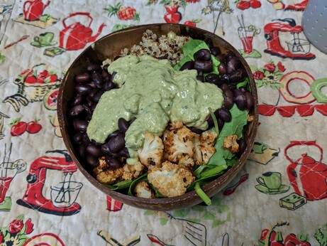 Tonight's dinner was another fantastic bowl. Romanesco and butternut squash roasted with shawarma seasoning, Greek potatoes, crispy smokey Royal trumpet, all your basic salad veg, with garlic tahini dressing and vegan tzatziki on the side.