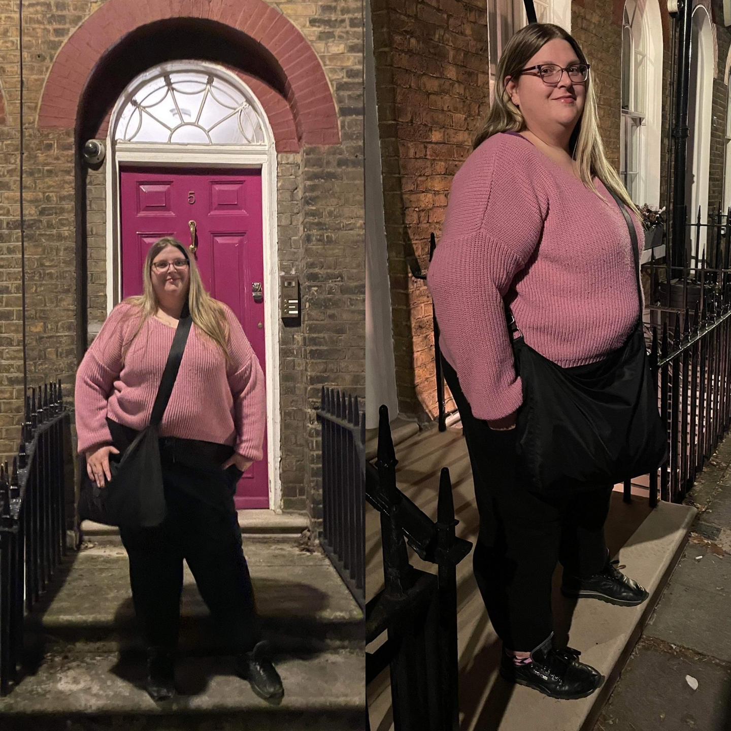 Outfit: pink Boohoo jumper, black ASOS joggers and black Reebok classics.