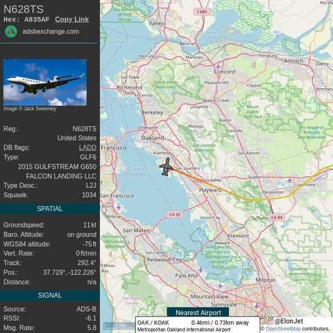 Elon jet has landed in Oakland. f*ck .. He's back. #elonjet #streisandeffect #elonmusk #whereswaldo