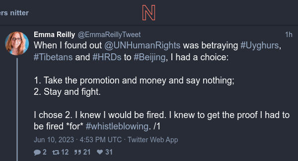 @EmmaReillyTweet RT by @badiucao: When I found out @UNHumanRights was betraying #Uyghurs, #Tibetans and #HRDs to #Beijing, I had a choice: 1. Take the promotion and money and say nothing; 2. Stay and fight. I chose 2. I knew I would be fired. I knew to get the proof I had to be fired *for* #whistleblowing. /1 https://nitter.hongkongers.net/EmmaReillyTweet/status/1667575830891864064#m