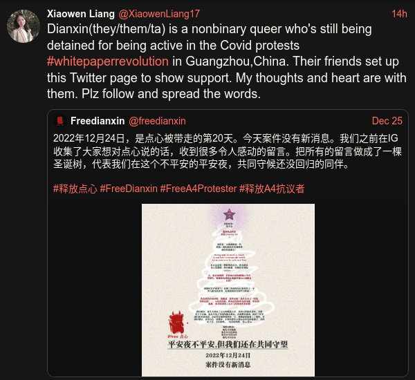 Dianxin(they/them/ta) is a nonbinary queer who's still being detained for being active in the Covid protests #whitepaperrevolution in Guangzhou,China. Their friends set up this Twitter page to show support. My thoughts and heart are with them. Plz follow and spread the words. https://twitter.com/freedianxin/status/1606839088744902656
