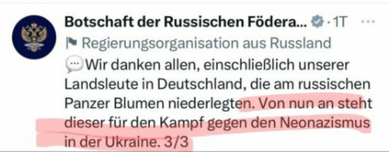 Dieser bedankte sich jüngst bei u.a. ihr & #WhoTheFuckIsAlice und zeigte, wofür diese Friedensbewegung u.a. steht. Für die Auslöschung des Neonazismus in der #Ukraine .Russland deutet damit sogar Wagenknechts Absichten um und sie lässt sich trotzdem vor Russlands Karren spannen. Kann man sich nicht ausdenken.