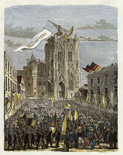 Anlässlich des 600ten Jahrestages der Grundsteinlegung des Doms treffen in Köln der preußische König sowie der Reichsverweser Johann von Österreich und etwa 300 eingeladene Abgeordnete der Paulskirche in Köln aufeinander - das einzige große Zusammentreffen der alten und neuen Mächte während der Revolution. Weil die Kölner dem König genauso zujubeln wie den demokratischen Repräsentanten, ... 1/2