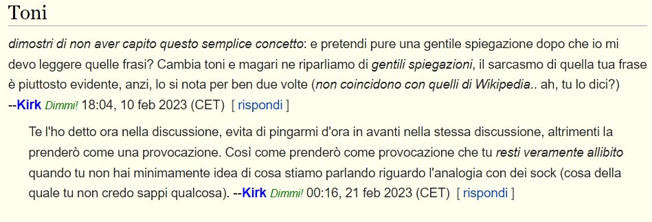 Non è passato nemmeno un giorno da quando ho fatto presente di certe uscite di kirk39 e certi toni che usa (e ha pure il coraggio di parlare di dare lezioni?!), sta roba onestamente inizia ad essere intollerabile.