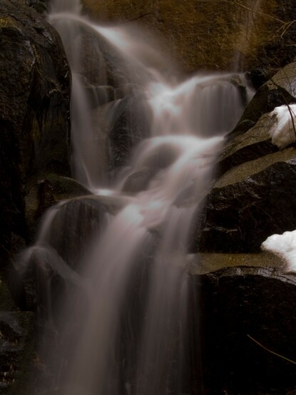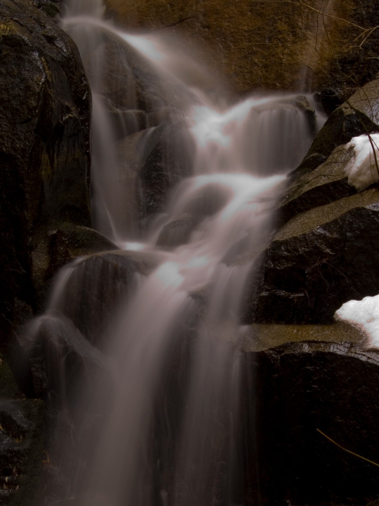 Wildcat Falls is a small waterfall by Yosemite standards. This fall would be considered large in most places as it falls 630 feet. The problem is that most of the fall is hidden and obscured by trees alongside the granite cliff that the water cascades down.