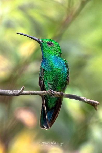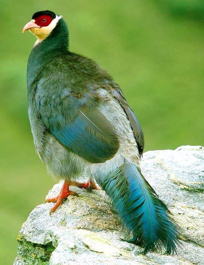 Head has red around the eyes and yellow. Body beautiful teal or blue green like the ocean.