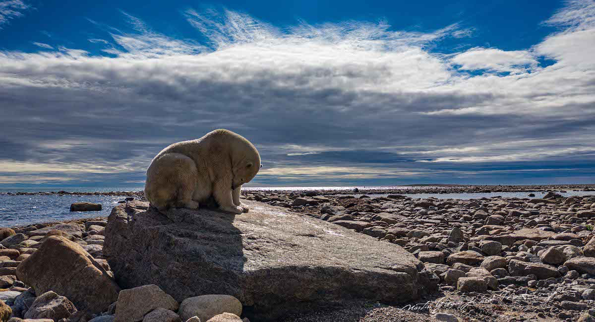 Polar Bear on a large flat rock. Sitting on a rocky shore with blue sky and clouds. Bear has head bowed.