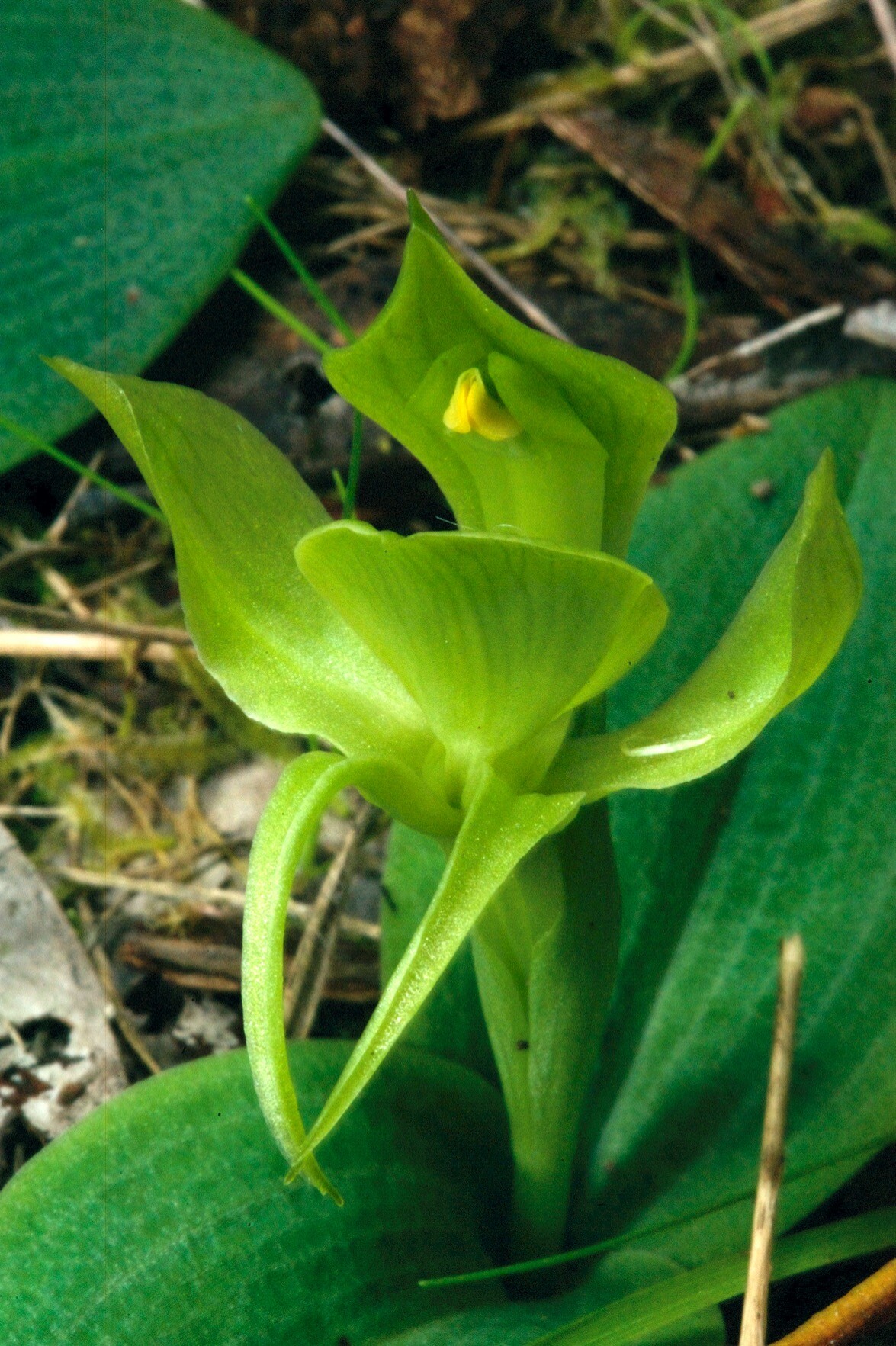 We've had a rare bird, and a rare animal - now let's try a rare orchid. This is a Green Bird Orchid (Chiloglottis Cornuta). Really does look like a baby bird begging to be fed!