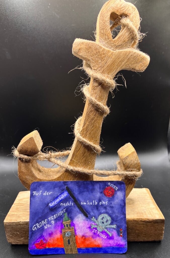 Der Song ist richtig super und hat mich dazu inspiriert, ein St. Pauli Potpourri zu malen. Straßenschild der Reeperbahn, Piratenschädel des FC, Astra Bier, Landungsbrücken, Elbe.