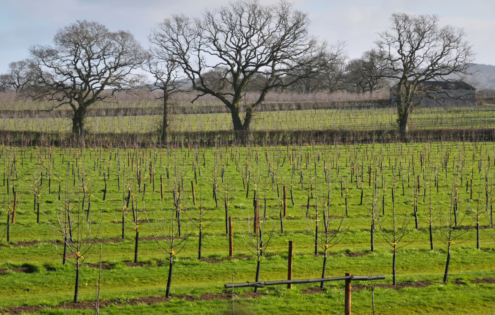 Young apple trees with their branches out, trained along wires. A few old trees stand witness.