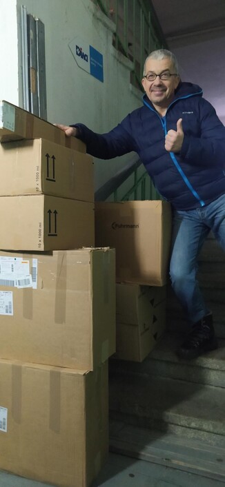 Dymitry bringt Gas, Thoraxdrainagen, Thoraxpunktionsets, Vakuumpumpen und Antibiotika nach Saporischschja.