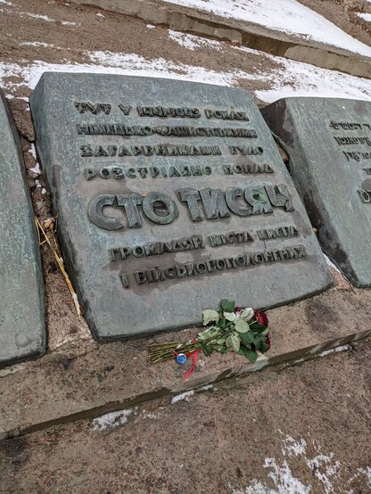 Heute am Ort deutscher Verbrechen, in Babyn Jar. hier massakrierten die Nationalsozialisten 1941 mehr als 33.000 jüdische Männer, Frauen und Kinder. Insgesamt wurden bis zur Befreiung Kyivs 1943 mehr als 100.000 ermordet. Die Erinnerung ist umkämpft.