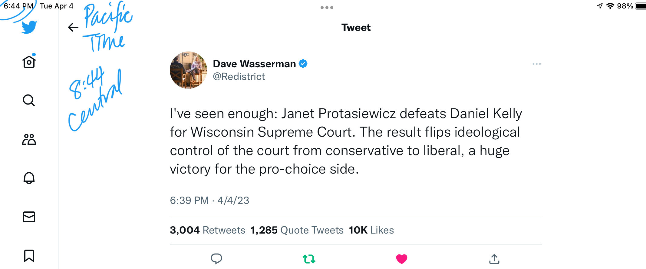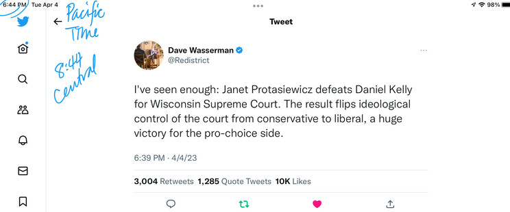 “I've seen enough: Janet Protasiewicz defeats Daniel Kelly for Wisconsin Supreme Court. The result flips ideological control of the court from conservative to liberal, a huge victory for the pro-choice side.”