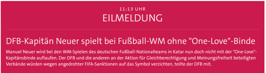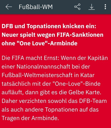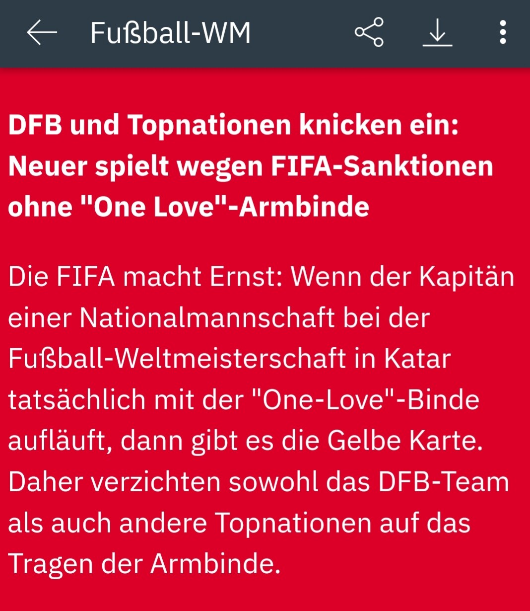 Schade. Ich hätte mir gewünscht, dass alle Mannschaften, die die One Love Binde tragen wollten, ihre Koffer packen und zum Flughafen fahren. Da hätte ich die Fifa Bosse mal sehen wollen, wie sie bettelnd am Gate stehen. Schade, dass diese Reaktion ausblieb. Wirklich schade.