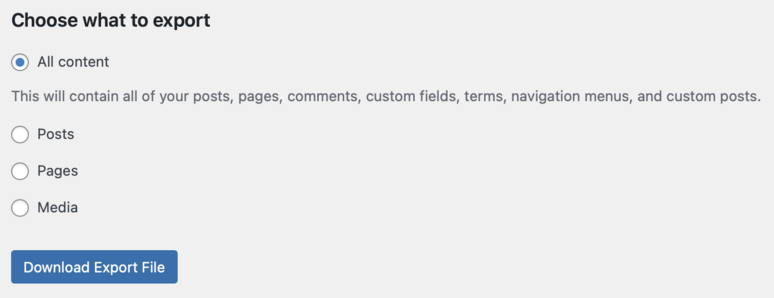 Over the last couple decades I've had several WP self-hosted and WP.com-hosted blogs. Whenever I have exported, I have selected All Content every single time.