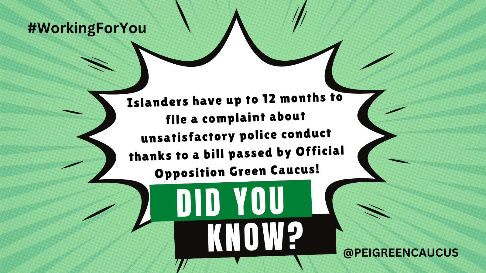 #DYK: Islanders now have up to 12 mths to file a complaint about unsatisfactory police conduct? Thanks to a bill by MLA Trish Altass, Islanders can have greater confidence police services are provided appropriately. #WorkingForYou #peipoli