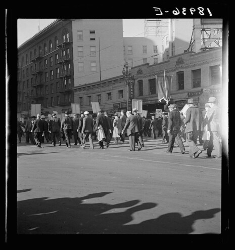 Mass meeting of #WorksProgressAdministrationWPA) workers parading up #MarketStreet, #SanFrancisco, #California. The meeting was held in protest to cuts made by #Congress in relief appropriations