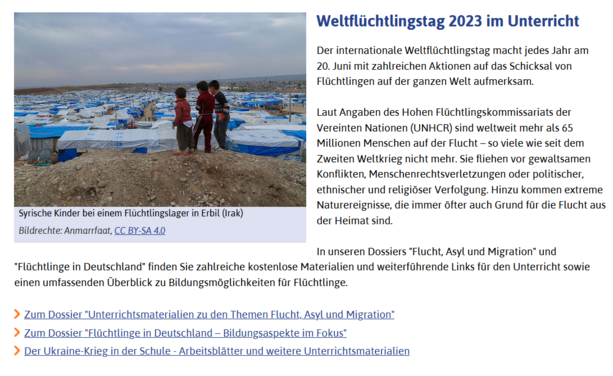 "Unterrichtsmaterialien zu den Themen Flucht, Asyl und Migration": https://www.bildungsserver.de/Materialien-zu-Flucht-Asyl-Migration-3377-de.html