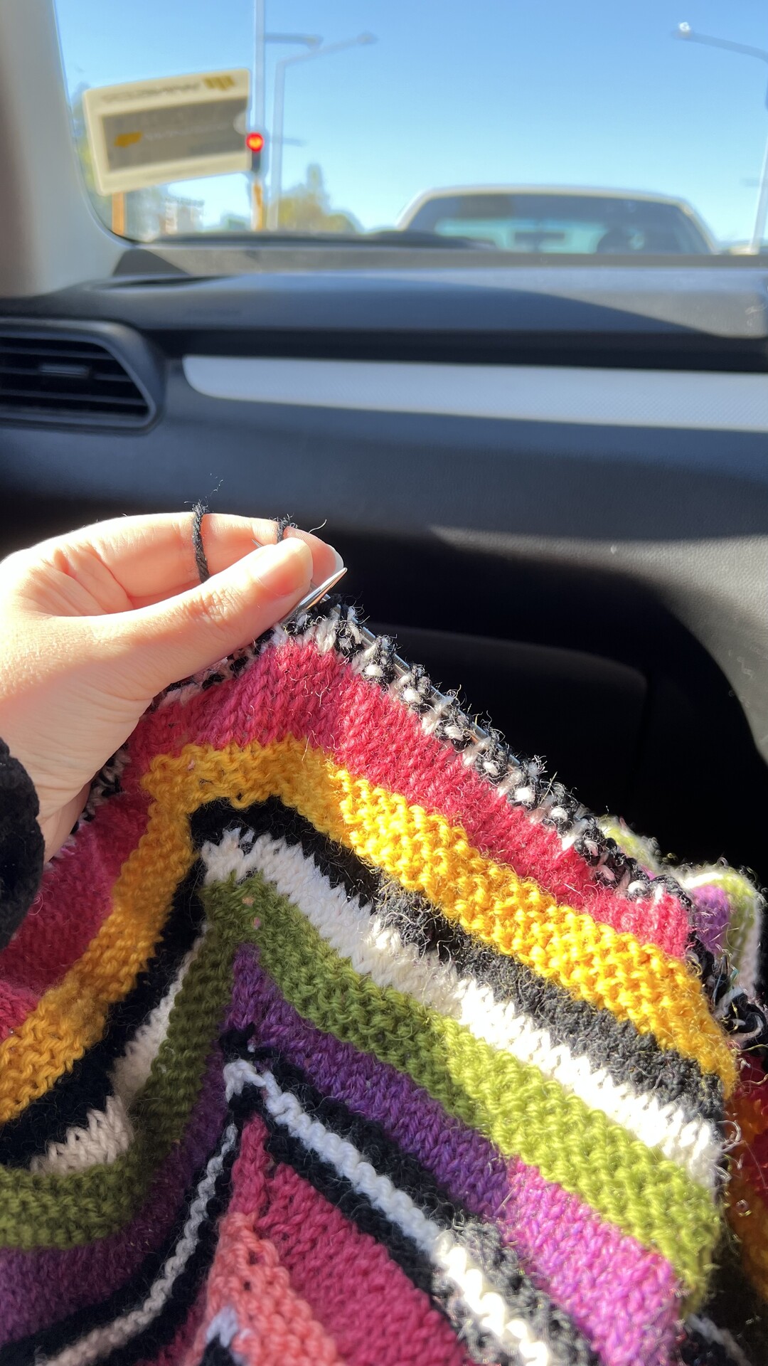 It’s worldwide knit in public day so car knitting the brioche section of my WestKnits Starflanket blanket.