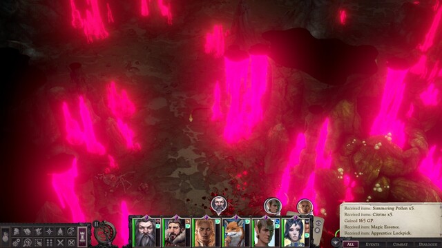 In this screenshot, my party is in a cave, and suddenly, many of the stalactites and stalagmites began glowing in bright fuchsia. This has happened on a number of occasions, and I have to log out and back in to fix it, but sometimes, I just have to play it like this until I move on to the next area.