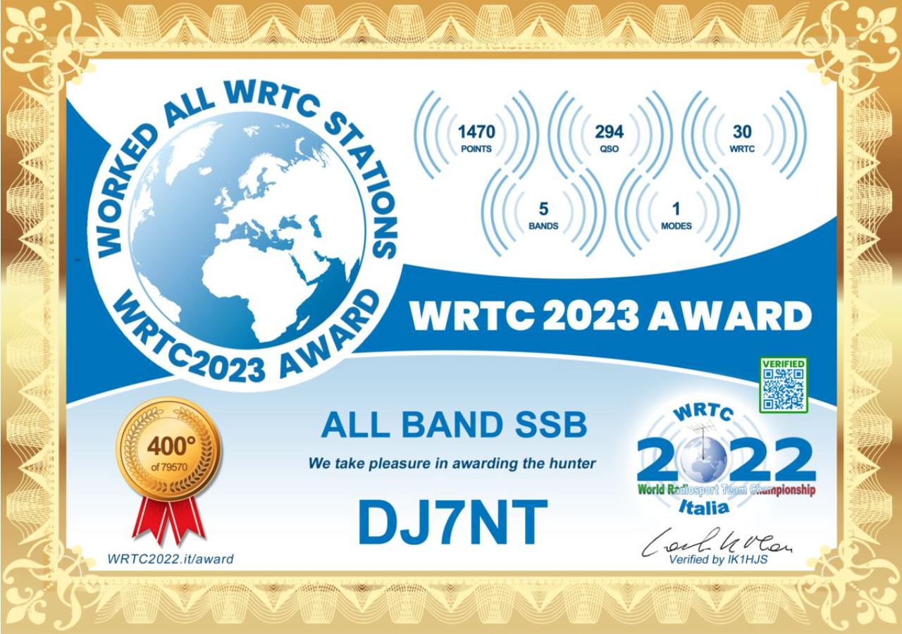 Did you know that the World Radiosport Team Championship (a.k.a WRTC) runs an annual event of WRTC branded special event stations all around the world? They're on the air all of January 2023 for amateur radio operators to make contact with. So far I've contacted 10 unique stations across the US, Portugal, Canary Islands, and Bulgaria using single side-band (voice) and morse code.