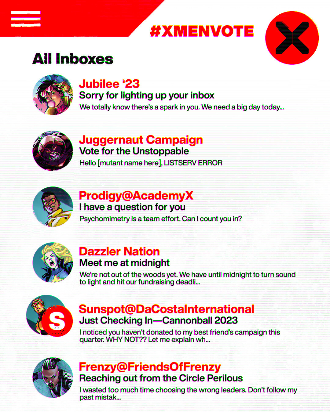 Make your mutant voice heard! β The #XMenVote begins now: http://marvel.com/articles/comics/2023-x-men-election-begins-now-polls-open #marvel