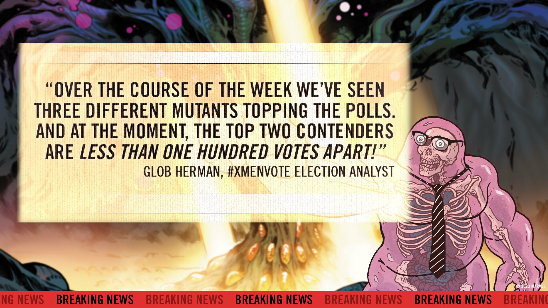 BREAKING IN ACROSS KRAKOAN NETWORKS: It's Glob Herman, #XMenVote election analyst, with a special report. β Vote now at http://marvel.com/XMenVote #marvel