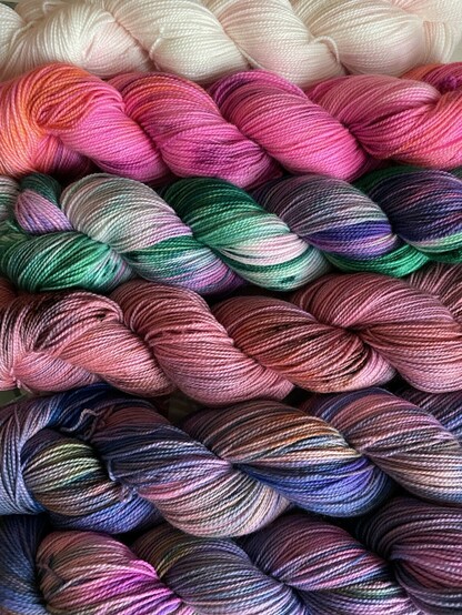 Finally got around to skeining these beauties! Several OOAK skeins, two of which I want to try to recreate at some point. Which two would you go for? #Yarn #YarnMastodon #HandDyedYarn #Knitting #Crochet #KnittingMastodon #CrochetMastodon