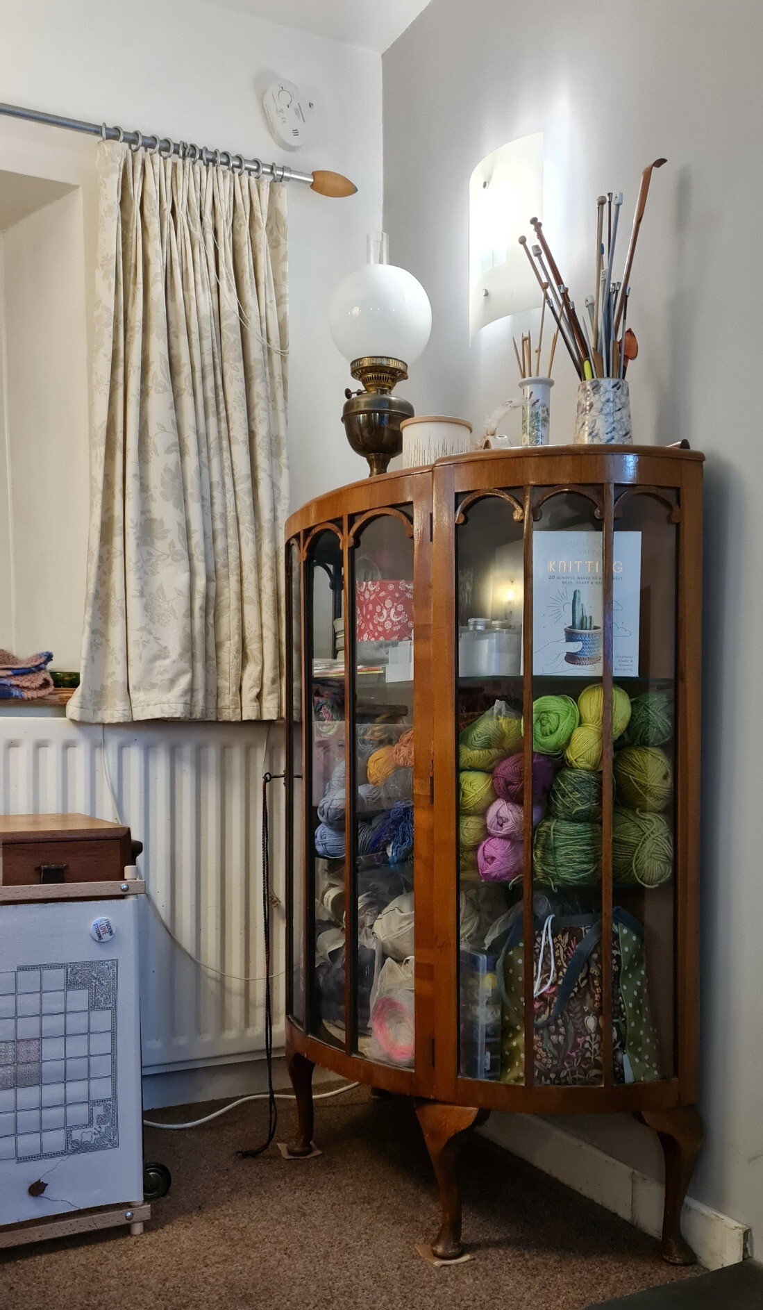 Today I bought an old display cabinet for sale on Facebook marketplace. Very local and a very good friend. Went to have a look after choir rehearsal and it was just what I wanted. Yes, it is now my stash cupboard, current knitting projects, needles etc and pattern books. Love it.