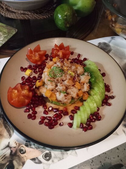 Today in Lourde's Restaurant (which luckily is our home) - something with avocado, mango, cilantro, shrimp surrounded by cucumber, tomatoes, and grenadine. Spectacular, we could open a restaurant really. Something like tuna tartar really with shrimp. #food #photography #cooking #yummyyummy #eating