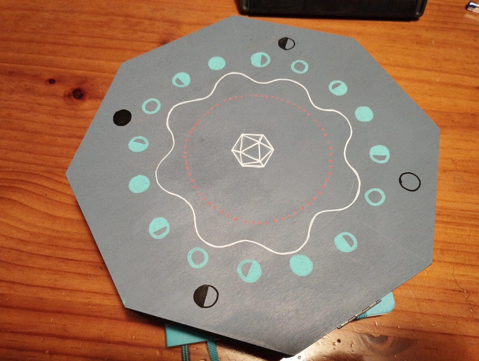 Update: Le falta pegarle un par de relieves para que ambas partes queden niveladas la abrirse y forrar el otro interior, pero estoy muy contenta con cómo ha quedado!!! El diseño está inspirado en las lunas de #Zanarok, el mundo homebrew de nuestro DM en el que llevo jugando desde la pandemia.