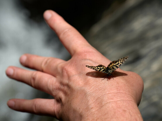Spanish festoon (Zerynthia Rumina) sitting on the hand of @lillamariposa
