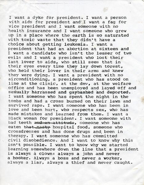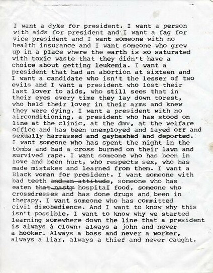 “I want a dyke for president. I want a person with AIDS for president and I want a fag for vice president and I want someone with no health insurance and I want someone who grew up in a place where the earth is so saturated with toxic waste that they didn’t have a choice about getting leukemia . . . "