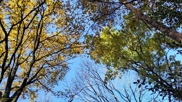 Wat een heerlijke groene vrijdag: zon, licht windje, vallende blaadjes, nog een paar zingende vogels, en genoeg te zien. De ene eik is nog groen, terwijl de ander bijna op het punt staat om al zijn blaadjes te laten vallen. #GreenFriday #Zomereik